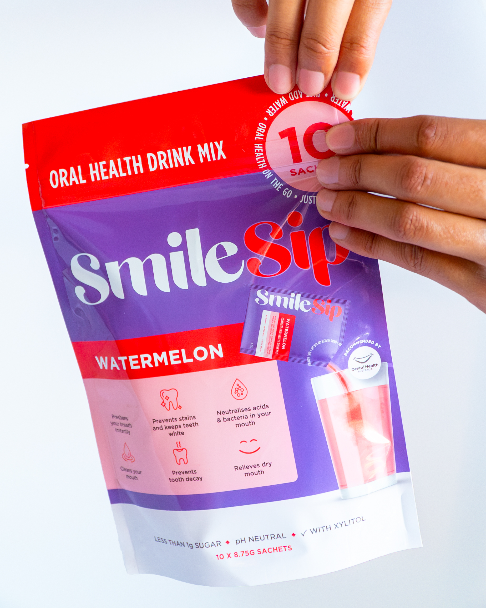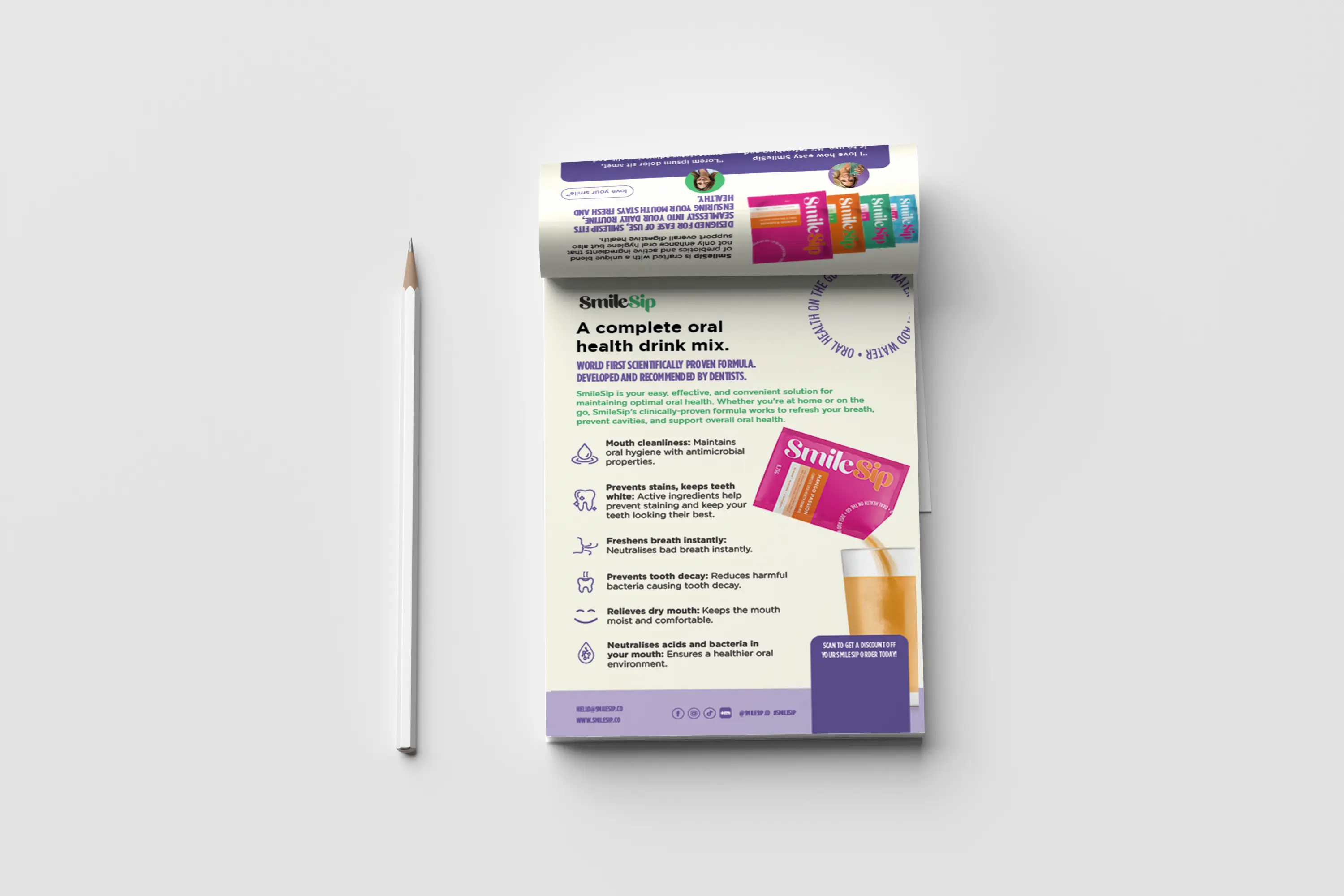 I created the brand identity and packaging for SmileSip, a pH-neutral oral health drink mix made to support everyday dental care. My work included the logo, colour palette, typography, flavour system, icons and the full packaging design.